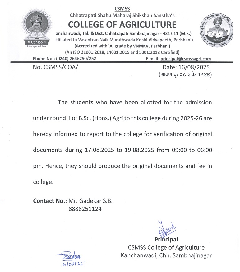 16-08-2025 - Notice for Students Allotted in Round II for B.Sc. (Hons.) Agriculture - 2025-26.